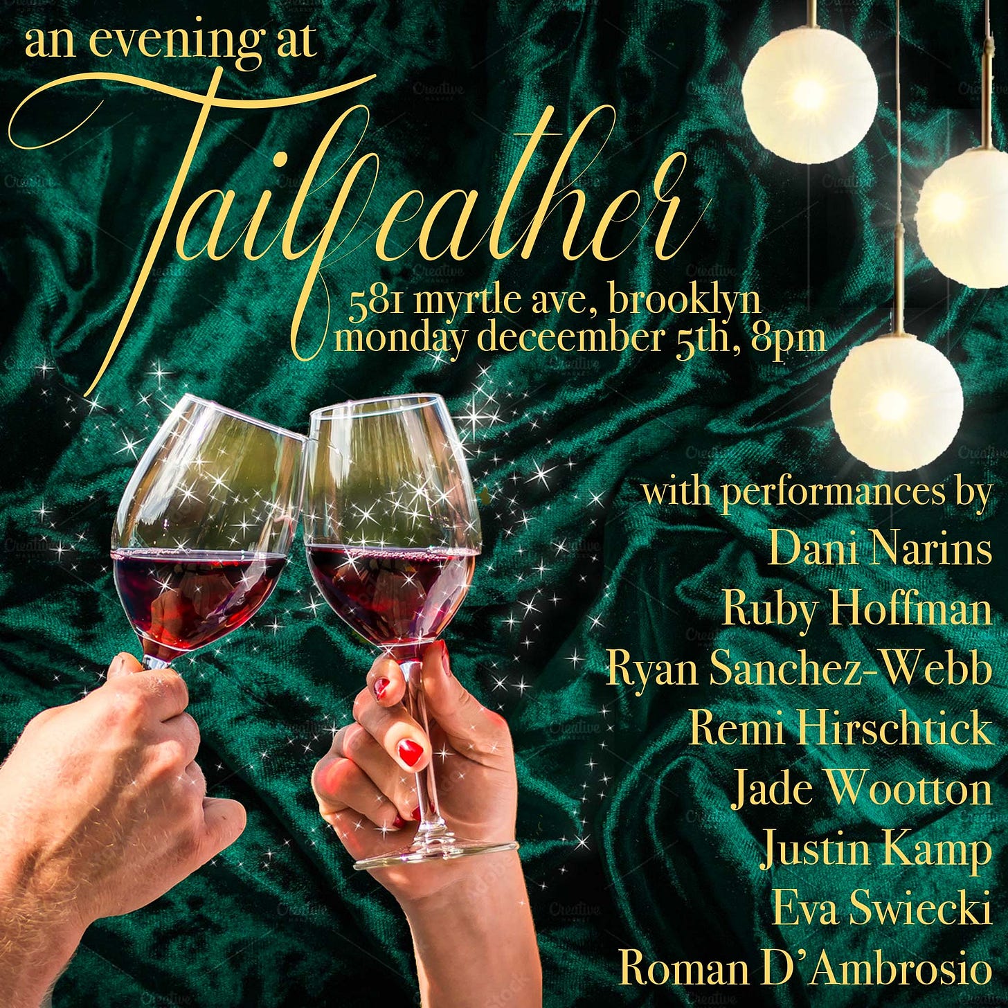 Iβve set up a reading at Tailfeather, the wine bar I work at in Clinton Hill, on Monday, December 5th at 8 PM. The lineup is stacked. Iβll be hosting the event, reading my own work, and bartending.