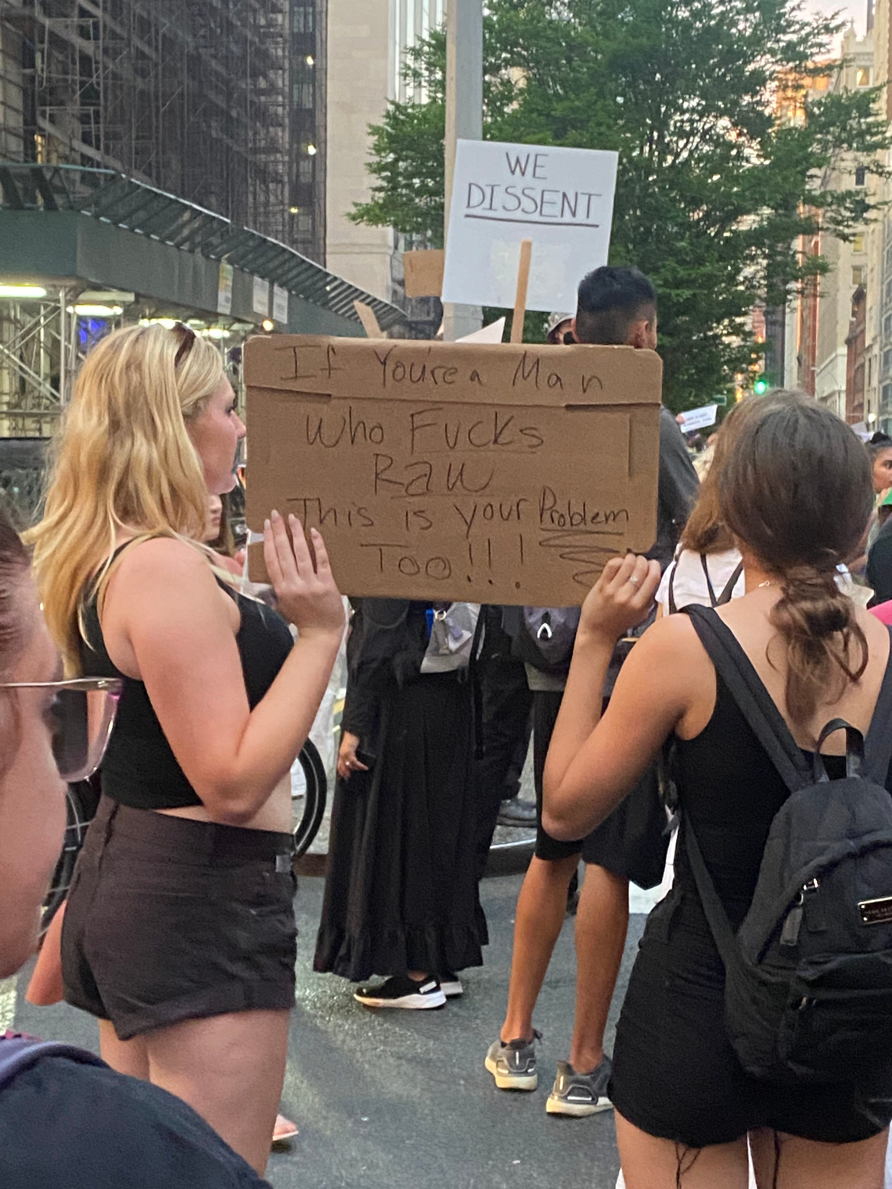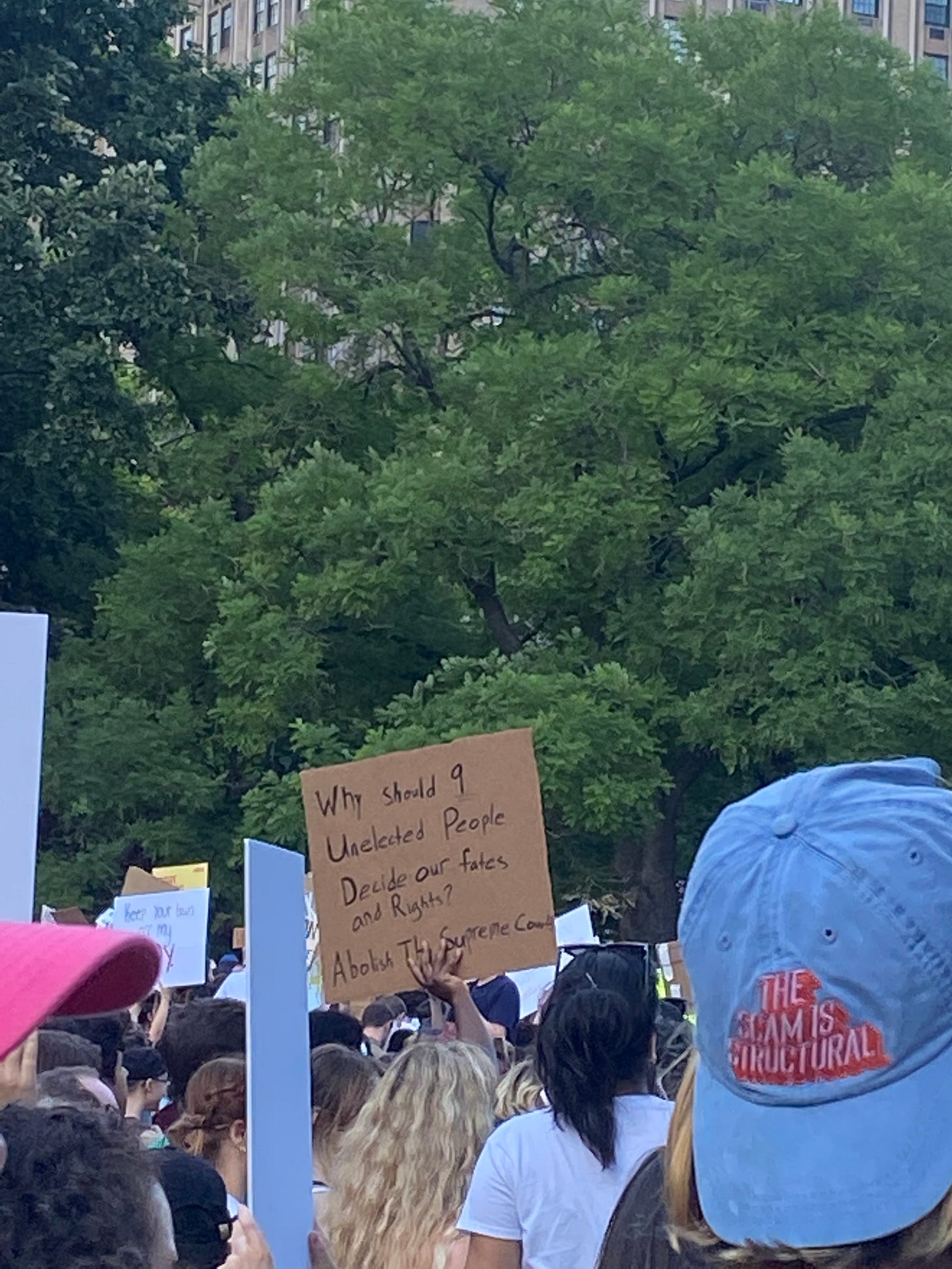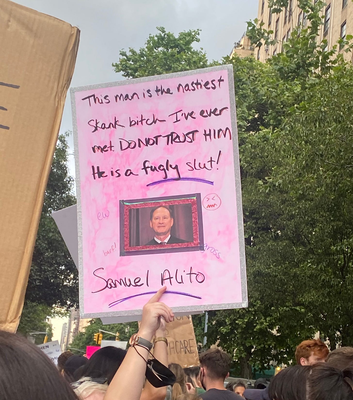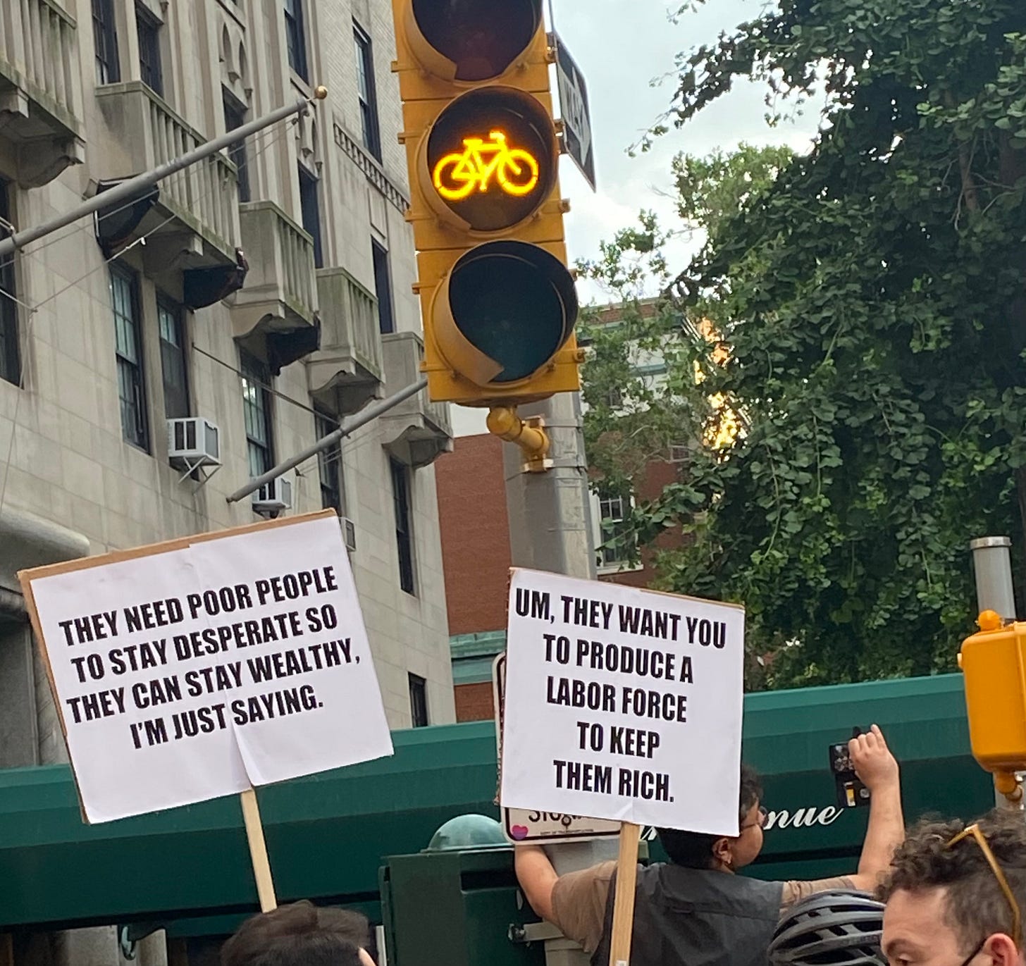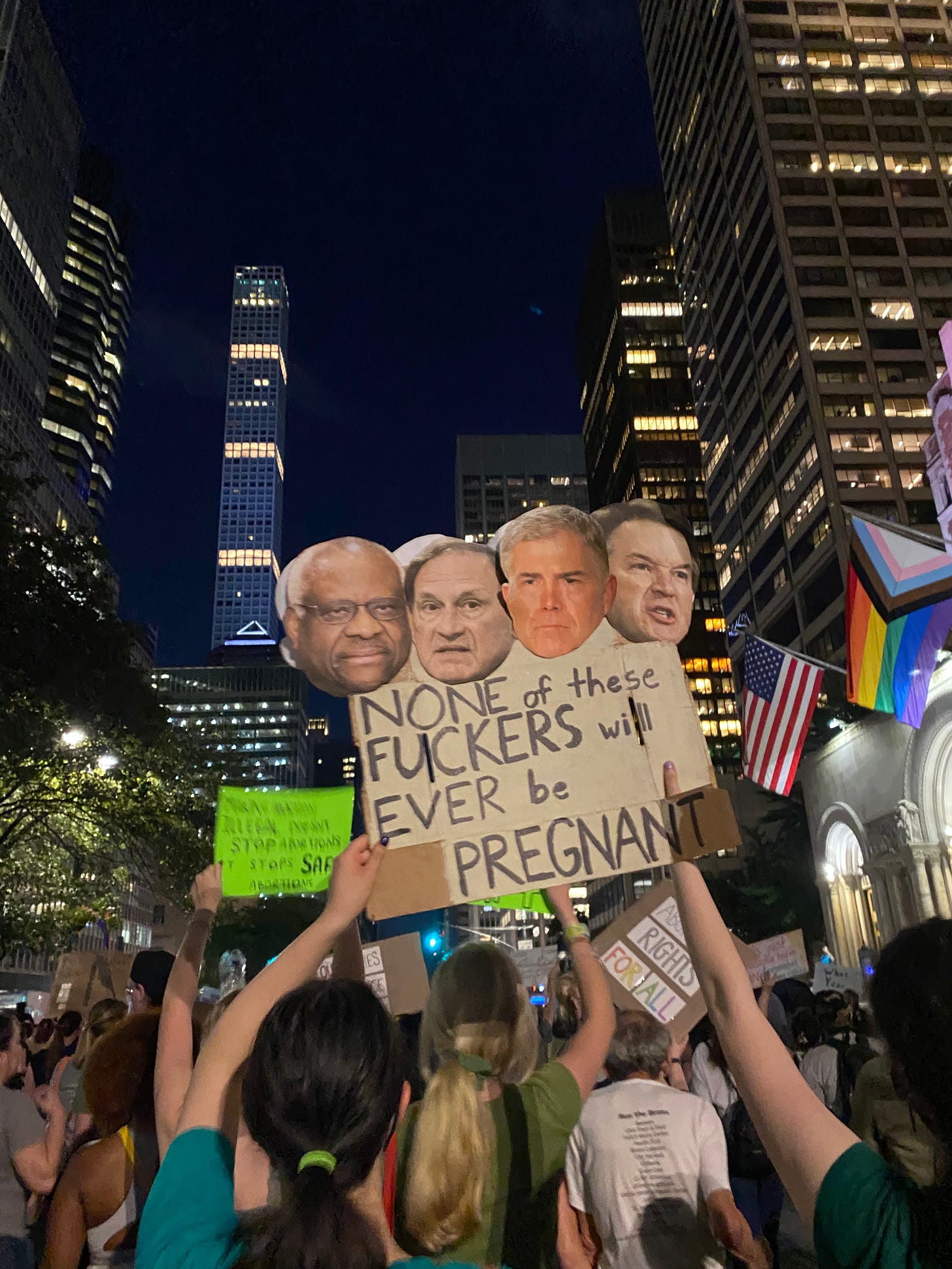 I’m always interested in what posters people choose to make for protests — in NYC, there’s no shortage of creativity when it comes to public dissent. Yesterday, I vacillated between finding the sea of posters deeply depressing (what good can art do in a corrupt state like this; are we really making light of this situation; ugh some of these posters are coming across in a really neolib TERF-like manner or are just straight up cringe; etc.) and also being genuinely moved that people were finding ways to communally cope (maybe making art, shutting down traffic, and screaming in the streets really are the best forms of solace we have in a corrupt state like this). Here’s a representative selection of some of those posters, presented without comment.